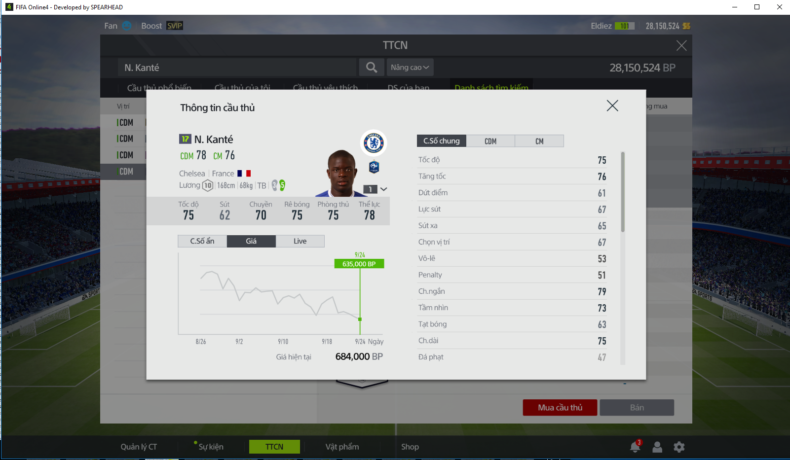 THỊ TRƯỜNG CHUYỂN NHƯỢNG: Từng là một cái tên được khao khát của rất nhiều team nhà nghèo nhưng hiện tại Kanté ss17+1 chỉ có giá ~600k BP. Một cái giá rẻ không tưởng với một cầu thủ chất lượng như vậy.