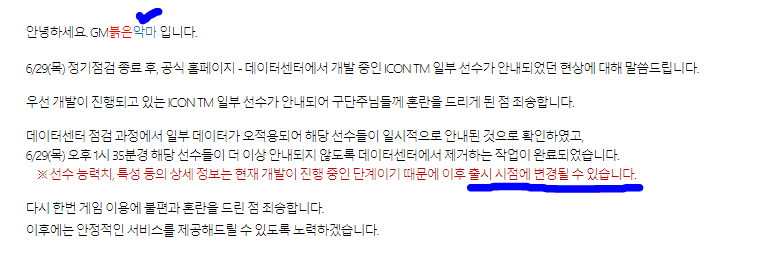 Đại ý là họ đã xảy ra một chút nhầm lẫn trong quá trình cập nhật dữ liệu khi update những cầu thủ đang ở trong giai đoạn phát triển lên hệ thống web tra cứu, điều này gây xáo trộn trong TTCN của game và họ khuyến cáo người chơi đừng vội vàng trong các quyết định của mình vì các cầu thủ này đang ở trong giai đoạn phát triển nên chỉ số có thể sẽ còn thay đổi.