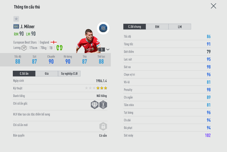 Tiền vệ gần như không biết mệt mỏi của tuyển Anh và Liverpool là một cái tên khá đặc biệt cho dù chỉ có 90. Đừng vội coi thường anh chàng này nhé. Khả năng lên công về thủ của Milner là cực tốt, rất phù hợp với bạn nào ưa lối đá tấn công chồng biên liên tục