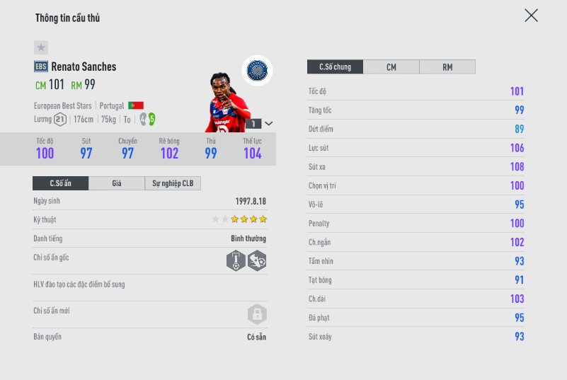 Tiền vệ người Bồ có hai kỳ Euro cực đáng nhớ, đặc biệt vào năm 2016. Tài năng của Sanches là không phải bàn cãi, nhưng anh cứ mãi không bật được cái bóng là một tài năng trẻ. Trong game dù qua nhiều mùa giải nhưng Sanches vẫn chỉ được coi là một con hàng chơi để trải nghiệm mà thôi. Mùa EBS cho chúng ta một tiền vệ cực dữ dỗi ở khu vực giữa sân, điểm yếu duy nhất của anh chàng này là không chiến