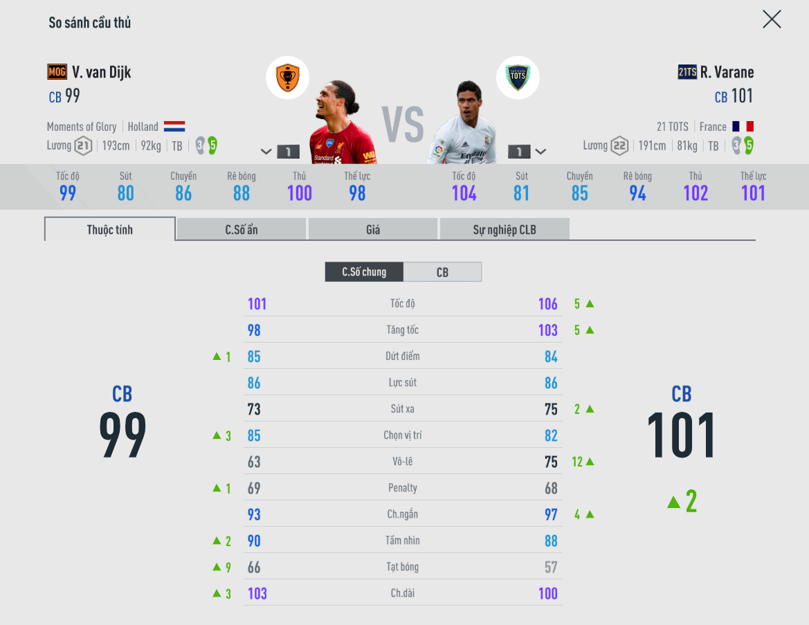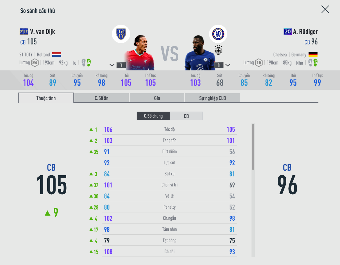 Cặp đôi được nhiều cao thủ trong thi đấu các giải đấu lớn lựa chọn. Bởi cả hai có đầy đủ mọi tố chất của những trung vệ hàng đầu. Với chiều cao trên 1m90 làm tiêu chuẩn của các trung vệ hiện đại. Cả Van Dijk và Rudiger đều thực sự trở thành những lá chắn thép trước khung thành. Tuy không có được tốc độ tốt nhưng sức mạnh thể hình cùng xải chân sải sẽ giúp cặp đôi này bù đắp được điểm yếu đó.