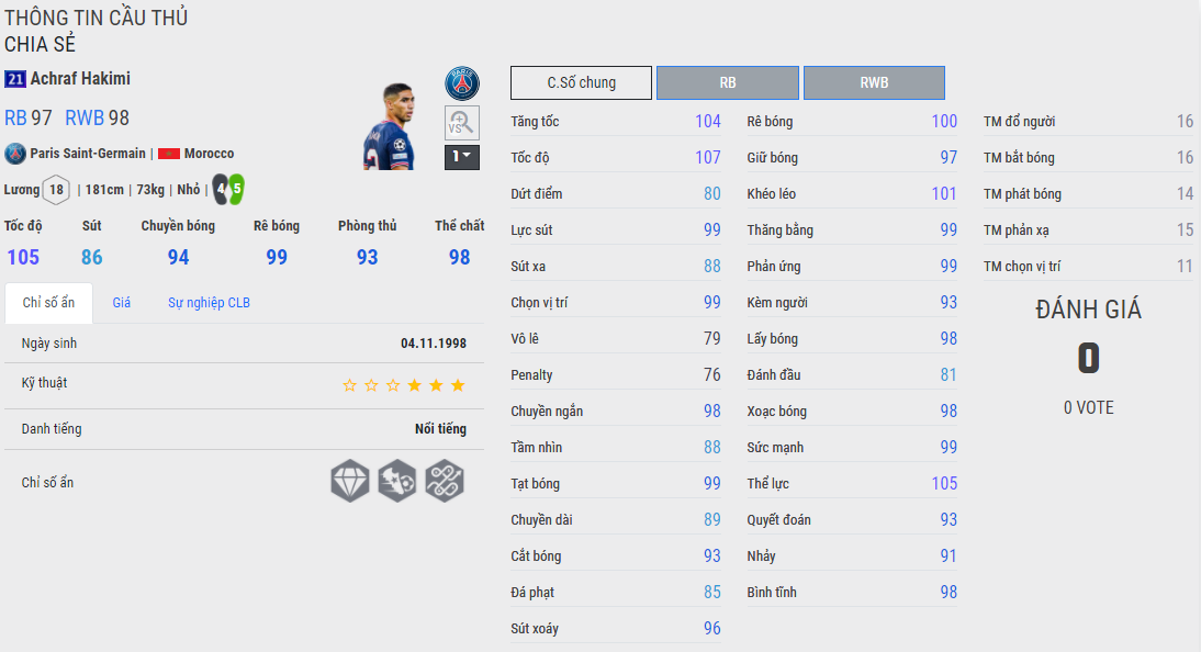 Hậu vệ cánh mới chuyển qua thi đấu cho PSG, thi đấu cực hay trong vai trò một RCB trong sơ đồ 523 của GLXH, nhanh và có khả năng tấn công tốt, Hakimi là một mẫu cầu thủ cực hợp cho chế độ này
