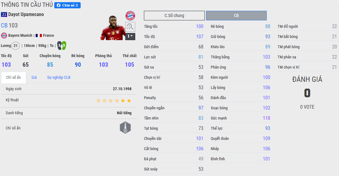 Thêm một cái tên của Bayern, tương tự như Pavard thì Upa cũng có được một thống kê trên cả tuyệt vời, thậm chí ở các hạng mục như không chiến, cắt bóng thậm chí còn mạnh hơn cả Pavard