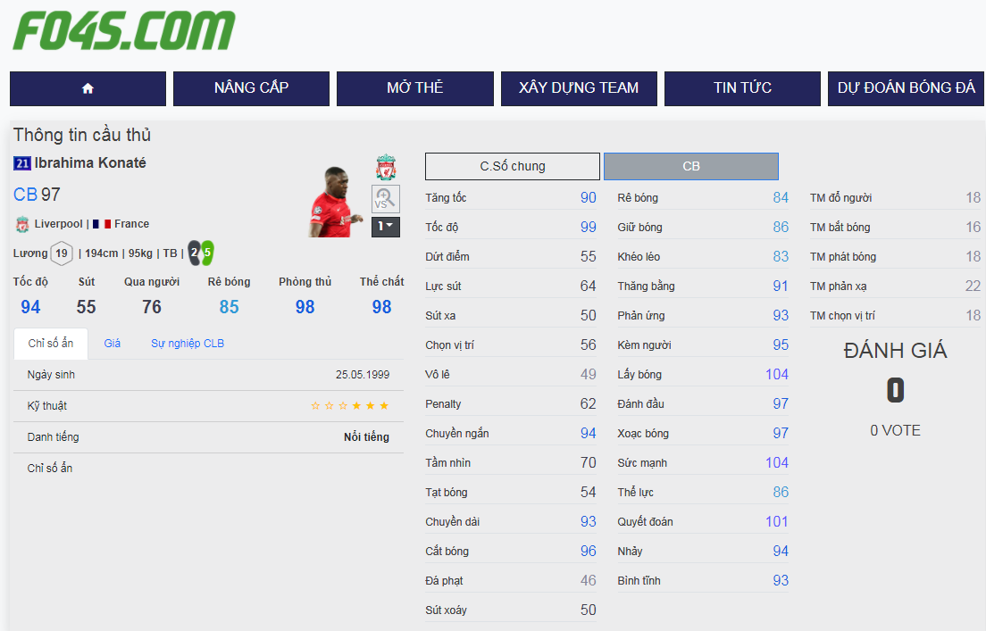 hậu vệ của Liverpool đang chỉ có chỉ số 97 trong khi tốc độ đang là 99, đây rõ ràng là một cái tên đầy tiềm năng dành cho các tín đồ thích chơi hàng mới, và trải nghiệm. Khoan chưa bàn với việc sau này có được tăng chỉ số hay không nhưng với màn trình diễn hiện tại của anh trong các trận đấu vừa qua, Konate rất đáng để kỳ vọng