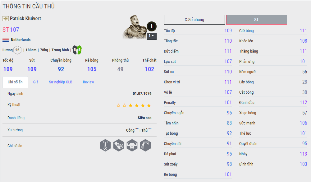Cái tên đầu tiên được nhắc đến dĩ nhiên chính là hung thần của Fo3 Patrick Kluivert ICON. Dẫu rằng bước sáng FO4 thì anh bị suy giảm đi rất nhiều so với phiên bản cũ của game. Nhưng có vẻ khi mà Nexon cho ra mắt phiên bản ICON thì đã có những thay đổi tương đối rõ rệt. Kluivert ICON là một tiền đạo toàn diện và là mùa giải duy nhất mà anh thi đấu tốt với hai chân 5/5, có ma tốc độ và đặc biệt là thể hình, sức mạnh cực tốt. Tuy nhiên điểm yếu lớn nhất của Kluivert chính là anh rê bóng khá thô, khoản chạy chỗ cũng không thực sự nhạy bén cho lắm. Chưa kể khoản không chiến từng được coi là vua đánh đầu của FO3 cũng bị nerf đi khá nhiều.