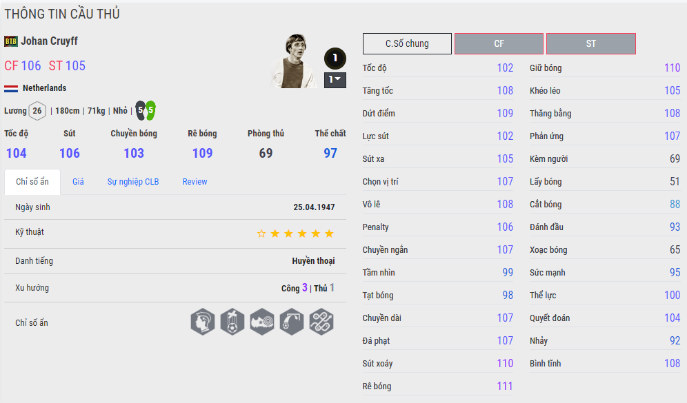 Một cái tên nữa mà có lẽ khá nhiều người đã quên, chính là Johan Cruyff - Vị thánh của bóng đá thế giới. Không có được thể hình to khỏe, nhưng Johan Cruyff lại có được khả năng di chuyển không bóng cực hay và nhạy bén. Nhờ vào một tốc độ khá tốt, huyền thoại của các huyền thoại này có thể bứt tốc quãng ngắn rất tuyệt vời. Thêm vào đó là khả năng xử lý bóng hai chân 5/5 vô cùng điêu luyện. Khi sử dụng Johan Cruyff bạn nên nhớ rằng hãy hạn chế D hay CD thôi, ZD và DD là hai phương án thành công cao nhất với ông. Và tất nhiên mùa giải ổn nhất cho đến lúc này chính là ICON, BTB, MC, EBS