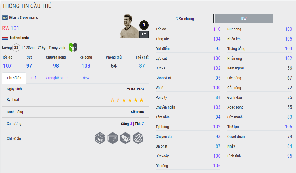 Marc Overmars EBS là mùa giải được đánh giá là có chất lượng tốt nhất về cả giá trị sử dụng lẫn mức giá ( trừ icon ). Đặc điểm nổi bật của mùa này chính là khả năng tạt bóng của Overmars ở mức rất tốt, lực chân của cầu thủ này đã được cải thiện lên đáng kế so với các phiên bản khác. Lực sút và ZD cũng có độ chính xác cao hơn. Giúp bạn có thể đa dạng trong lối chơi, tốc độ của Marc Overmars cũng đem đến cảm giác còn nhanh hơn cả chỉ số ghi trên thẻ.