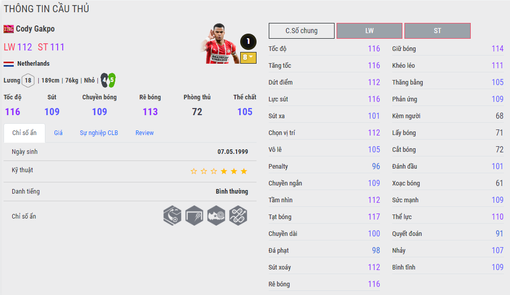 Một lựa chọn khác, mới nổi gần đây chính là Gakpo, cầu thủ trẻ này có thể hình phải nói là tuyệt vời, lên tới 1m89 và cân nặng cực phù hợp cho một cầu thủ chạy cánh. Việc chỉ số mùa 21NG dưới 100 giúp cho bạn có thể dễ dàng sở hữu cho mình mức thẻ +8, nhằm tối ưu hóa các điểm mạnh của anh chàng này. Nhưng cũng xin nhắc lại là cao to thì nhược điểm là rê bóng quá cồng kềnh, nếu như Gakpo chỉ chạy thẳng sau đó tạt bóng thì không nói làm gì, nhưng nếu bạn muốn anh chàng rê dắt, đảo người thì có lẽ đòi hòi hơi quá đấy.