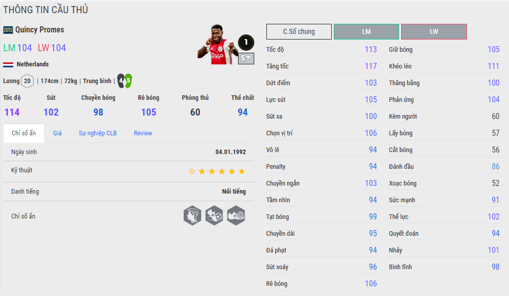Một phương án khác nữa là Quincy Promes 20TS, dẫu rằng giờ săn được mùa thẻ này là hơi khó những không phải là không thể, cách đây khoảng 2 năm mà chỉ số tốc độ của Promes đã cực ổn như vậy. Đây chính là phiên bản tuyệt vời nhất cho vị trí ở cánh với tốc độ nhanh, rê bóng dẻo, khó ngã và đặc biệt là hai chân 4/5.