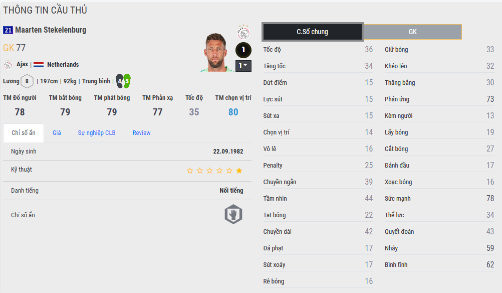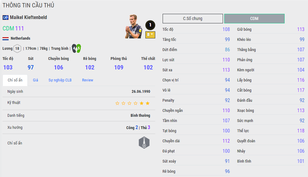Ngoài ra chúng ta có thể nhắc đến một cái tên mà cực ít người để ý là Maikel Kieftenbeld. Tiền vệ phòng ngự thuần thúy này có được thể hình tương đối khiêm tốn so với yêu cầu ở vị trí này 1m78. Nhưng bù lại thì việc có thể sử dụng hai chân ở mức rất tốt 4/5. Chỉ số Ovr tương đối thấp nên có thể sở hữu mức thẻ +8 mà không hề khó khăn. Kiefenbeld không khỏe, nhưng bù lại kỹ năng cắt bóng có lẽ sẽ khiến bạn phải giật mình đấy.