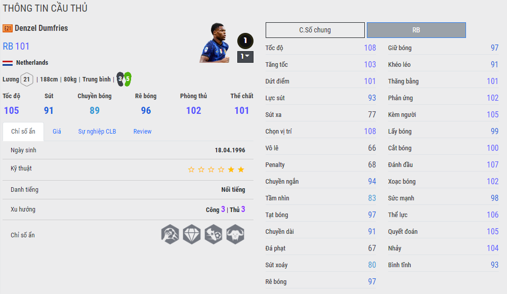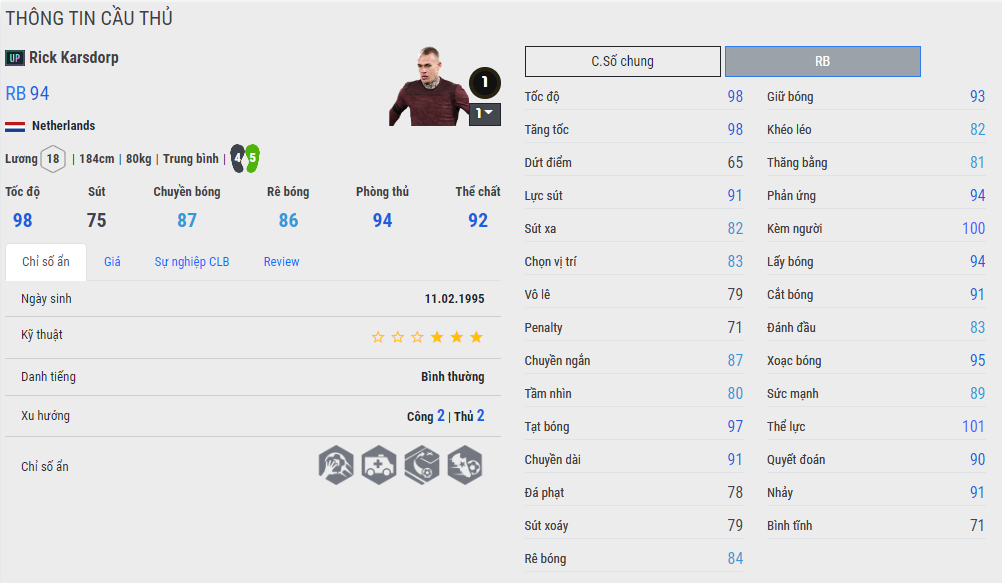 Đầu tiên chính là Rick Karsdorp UP khi mà anh này có chiều cao thể hình vào hàng tuyệt vời cho vị trí hậu vệ cánh, chỉ số ẩn cũng miễn chê nếu như bạn quan tâm đến các chỉ số tấn công. Tốc độ của Karsdorp là cực tốt nếu như bạn nâng cấp cho anh mức thẻ +8.
