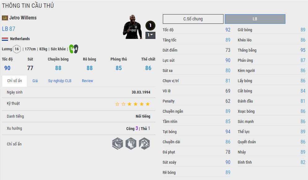 Có 3 lựa chọn dành cho người chơi là Daley Blind LH, Jetro Willems GR, Van Aanholt COC. Trong đó đa phần người chơi nghiêng về phía anh chàng Wilems GR nhờ ưu thế vượt trội về mặt thể hình khi sở hữu thể hình to khỏe, cùng với cân nặng có lẽ là hợp với meta nhất hiện nay. Bên cạnh đó Wilems còn có mức lương tương đối hợp lý, có kỹ năng tạt bóng sớm cực hợp cho meta tạt bóng hiện nay. Thêm một điểm cộng nữa là anh này có hai chân 5/4. Nên ít bị sai sót trong quá trình phòng ngự.