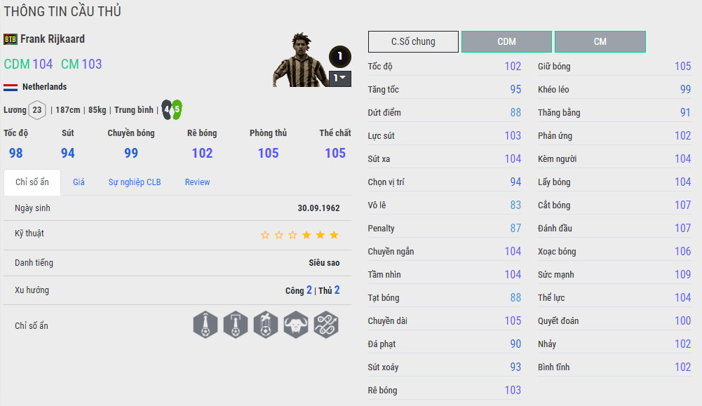 Cái tên đầu tiên không thể không nhắc đến chính là huyền thoại Frank Rijkaard với mùa giải EBS và BTB. Khỏi phải nói các bạn cũng biết đây chính là cầu thủ có sức khỏe vào hàng ảo nhất game, mặc dù ông chỉ cao có 1m87 nhưng khoản tông húc, đánh đấm thì khó có ai chịu nổi cú húc vai của Rijkaard. Không chỉ vậy, huyền thoại từng dành 3 chức vô địch C1 này lại có thể chơi chân cực tốt với 2 chân 4/5... AI cắt bóng vào hàng top. Vậy nên nếu bạn xây dựng team Hà Lan thì chắc chắn đây là cái tên không thể thiếu được.