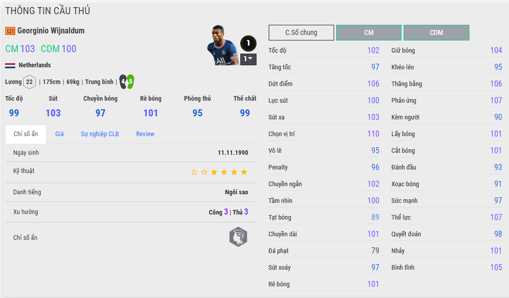Một cái tên của đương đại cũng khá toàn diện, phù hợp cho bạn nào thích mô típ một công một thủ chính là Wijnaldum mùa E21, có thể coi đây là một phiên bản Gullit thu nhỏ khi các chỉ số của anh này cực đồng đều, kỹ năng chuyền bóng cũng ở mức rất tốt. Một điểm cộng lớn của Wijnaldum là ở chế độ GLXH thì anh chàng sút rất kinh.
