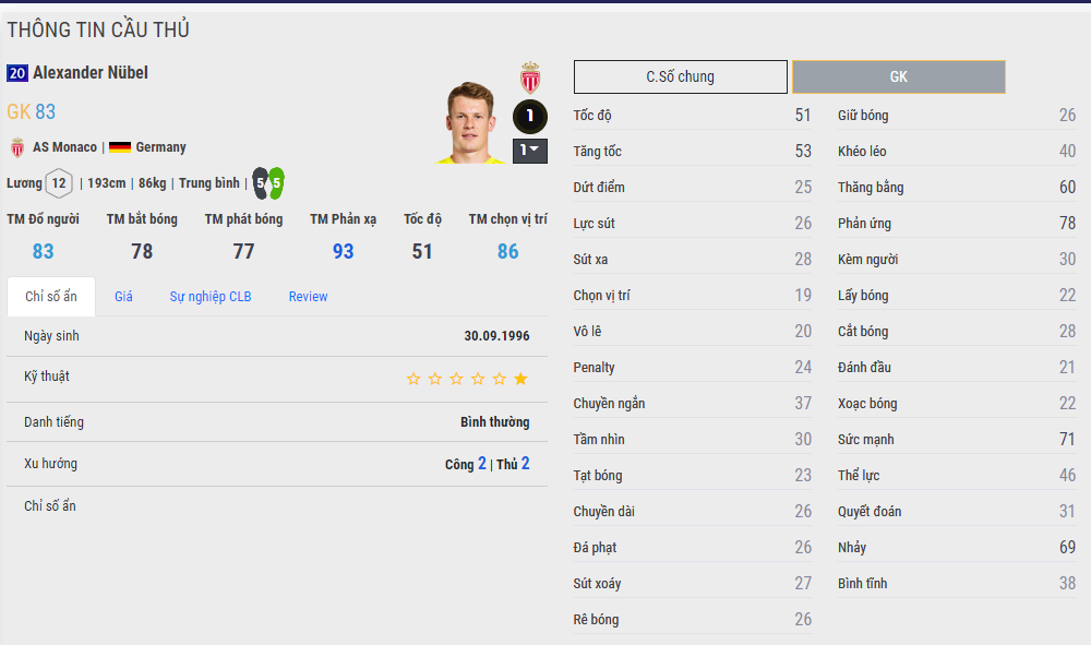 Alexander Nubel 20UCL là cầu thủ có chỉ số khá thấp 83, nhưng mức lương lại hơi cao 1 chút với mùa 20UCL. Một phần có lẽ chính là việc anh này có hai chân 5/5 điều khá hiếm gặp ở các thủ môn. Cho phép các pha cản phá các cú sút gần bằng chân cực hay. Bạn có thể thử qua.