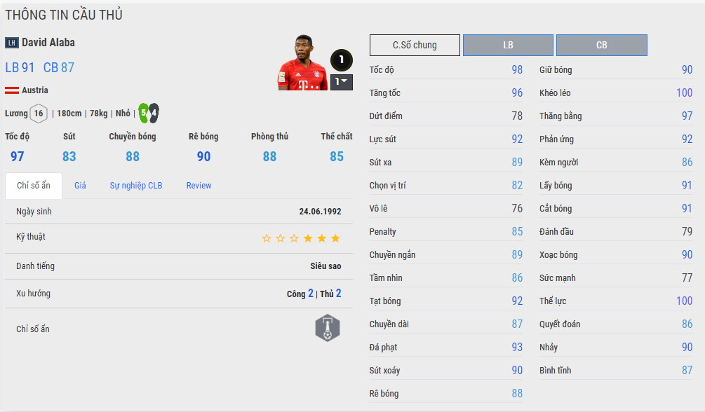 Cánh trái cái tên chắc chắn ai cũng sẽ nhớ đến đầu tiên là Alaba với hai mùa LH và 19UCL. Dù hiện tại Alaba đã bó vào trong đá trung vệ, nhưng AI của anh vẫn là cực hay tại vị trí hành lang cánh trái. Việc lương của Alaba cao ở những phiên bản trước khi mà giới hạn lương chỉ ở đầu 200 đã làm hạn chế rất nhiều đến độ phủ sóng của cầu thủ này.