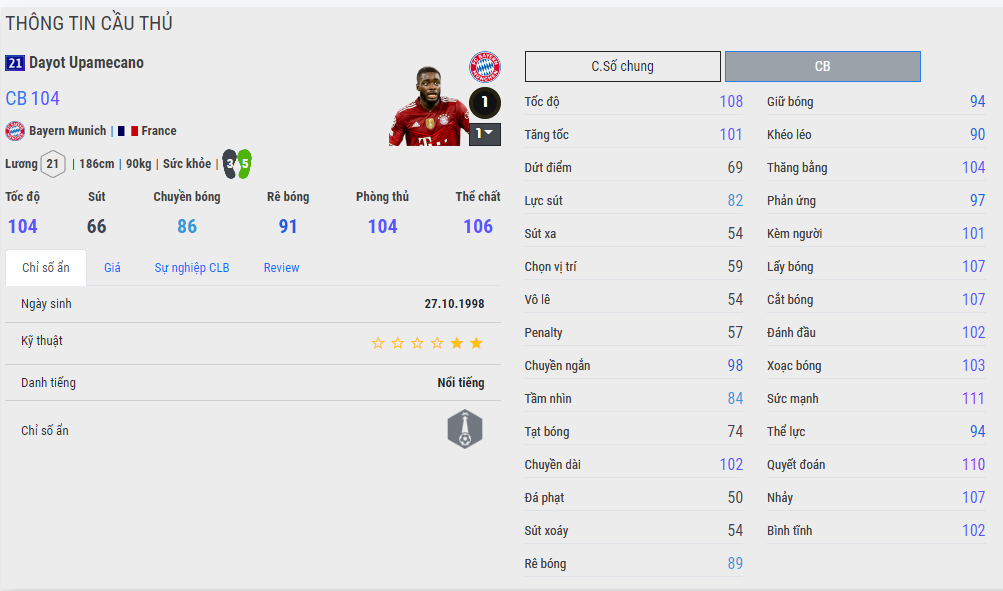 Một cái tên nữa chính là Upamecano 21UCL, trung vệ có thể hình và cân nặng cực tốt. Một máy ủi chính hiệu, Upamecano được Nexon chú ý từ phiên bản GR cách đây 3 năm. Và càng ngày càng được nâng cấp dần ở các khoản cắt bóng, đánh chặn. Phiên bản 21UCL của Upamecano có lẽ chưa phải tốt nhất của anh chàng này, vì dường như Upamecano sẽ còn tiến xa hơn nữa.