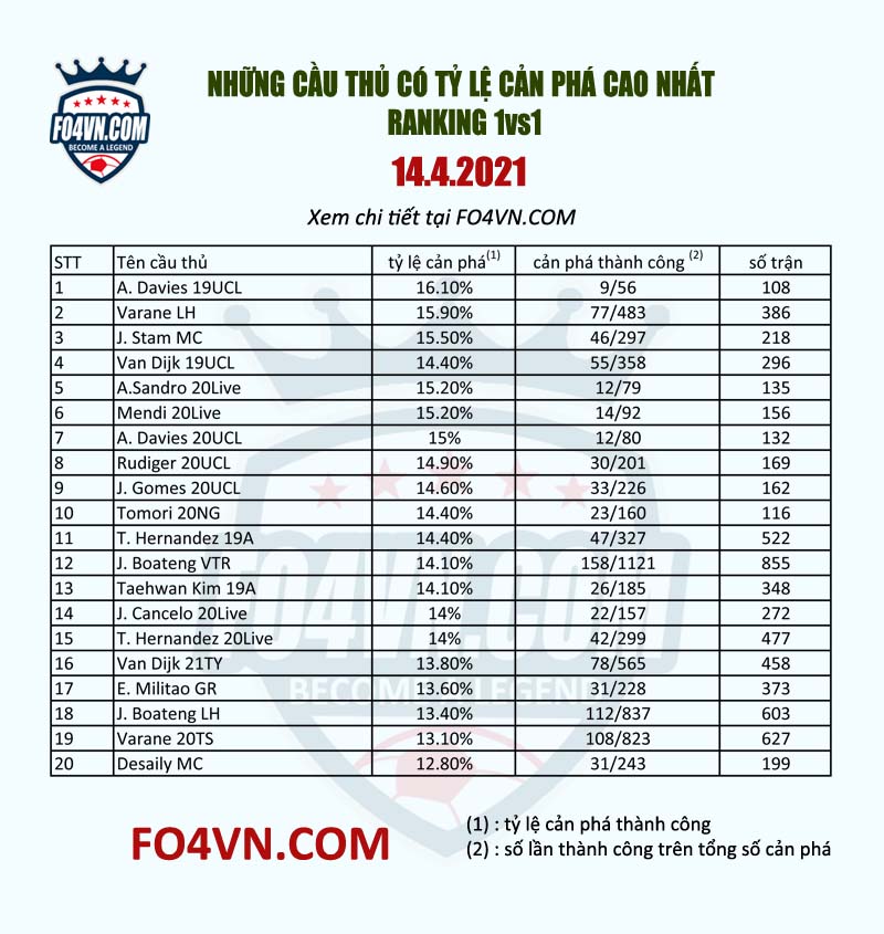 * Các cầu thủ có số lần cản phá cao nhất là Varane LH, Stam MC, Van Dijk 19UCL và Boateng so với số trận được thống kê. Và chúng ta thấy tiêu chỉ % thành công chỉ mang tính tương đối.