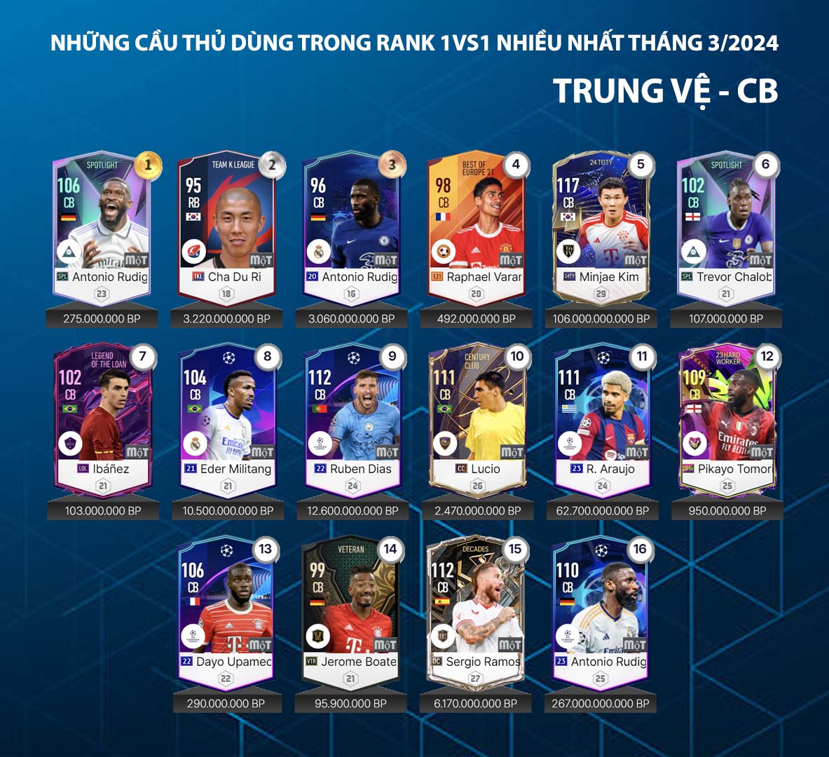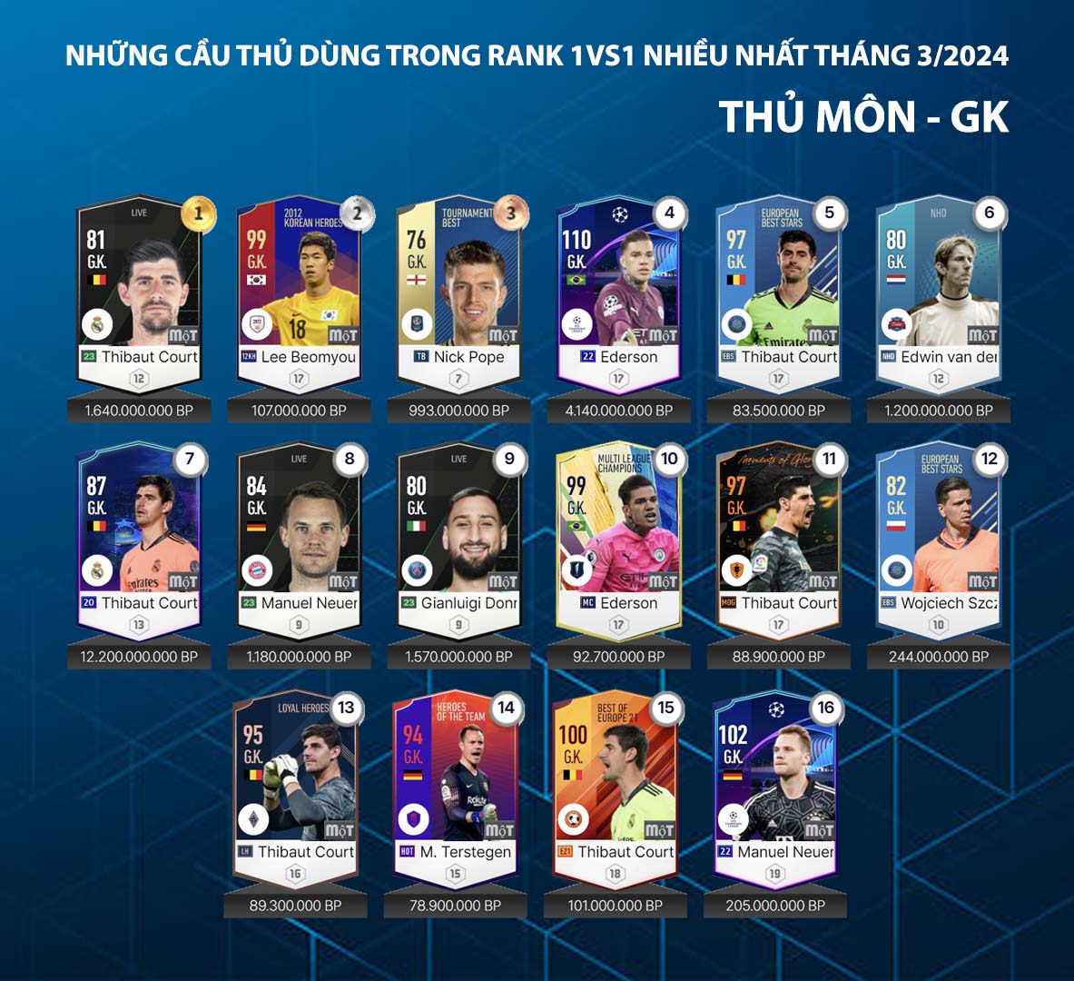Danh sách dưới đây được thống kê từ máy chủ về những cái tên được sử dụng nhiều nhất trong tháng qua của những game thủ rank cao tại máy chủ xếp hạng. Đây được xem là một trong những nội dung tham khảo đáng quan tâm và fo4vn.net hôm nay gửi tới cho các bạn danh sách những hậu vệ và thủ môn được sử dụng nhiều nhất trong tháng 3.