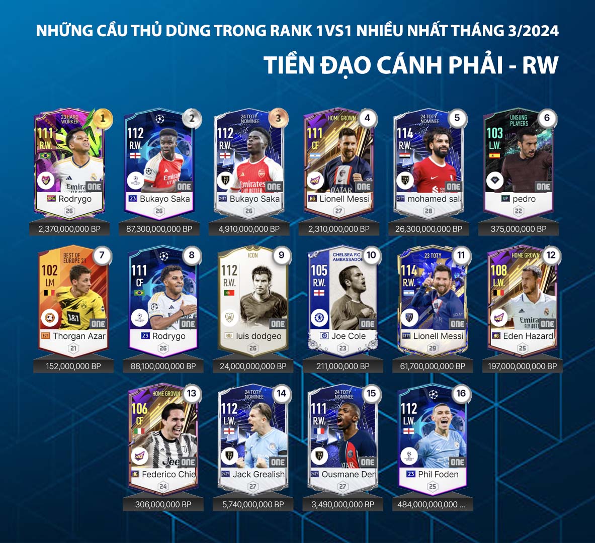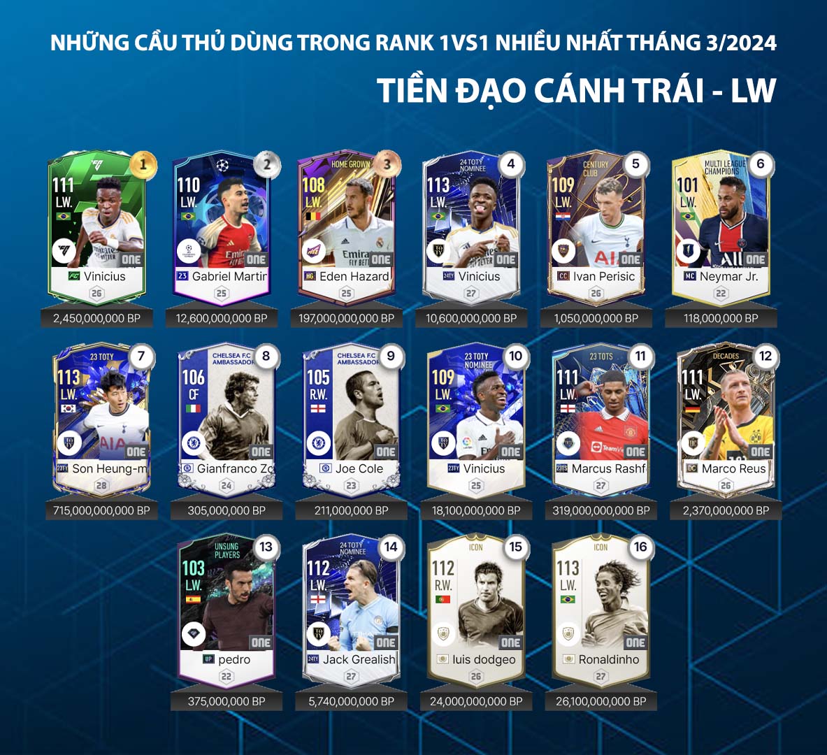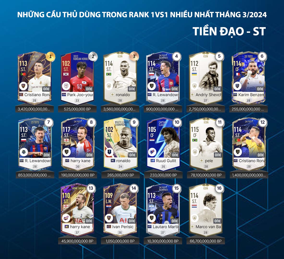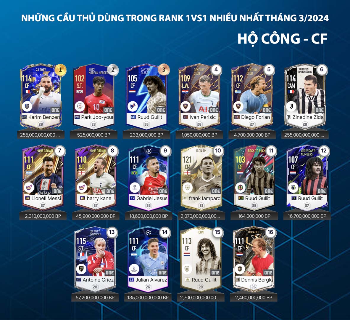 Danh sách dưới đây được thống kê từ máy chủ về những cái tên được sử dụng nhiều nhất trong tháng qua của những game thủ rank cao tại máy chủ xếp hạng. Đây được xem là một trong những nội dung tham khảo đáng quan tâm và fo4vn.net hôm nay gửi tới cho các bạn danh sách những tiền đạo được sử dụng nhiều nhất trong tháng 3.