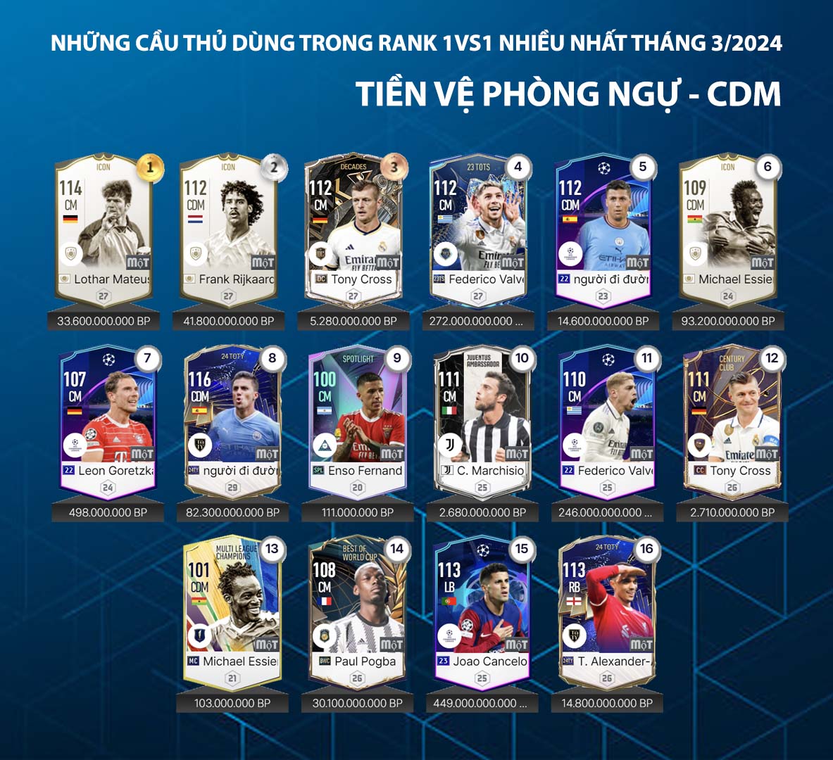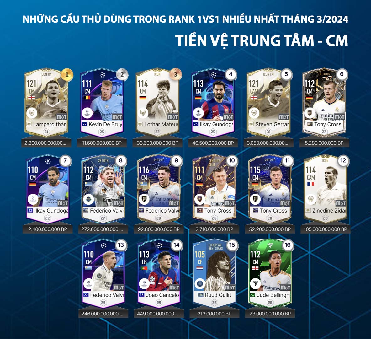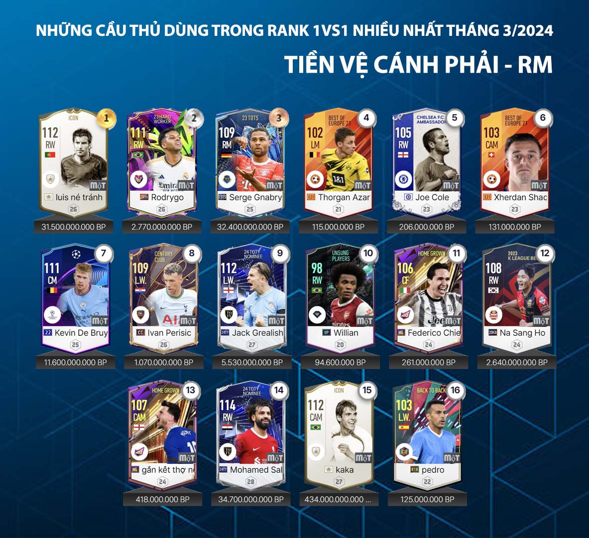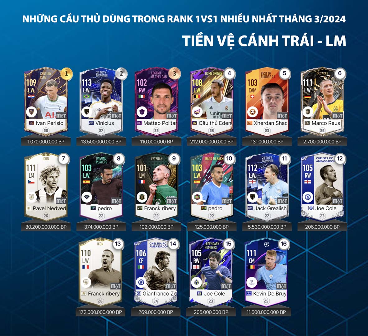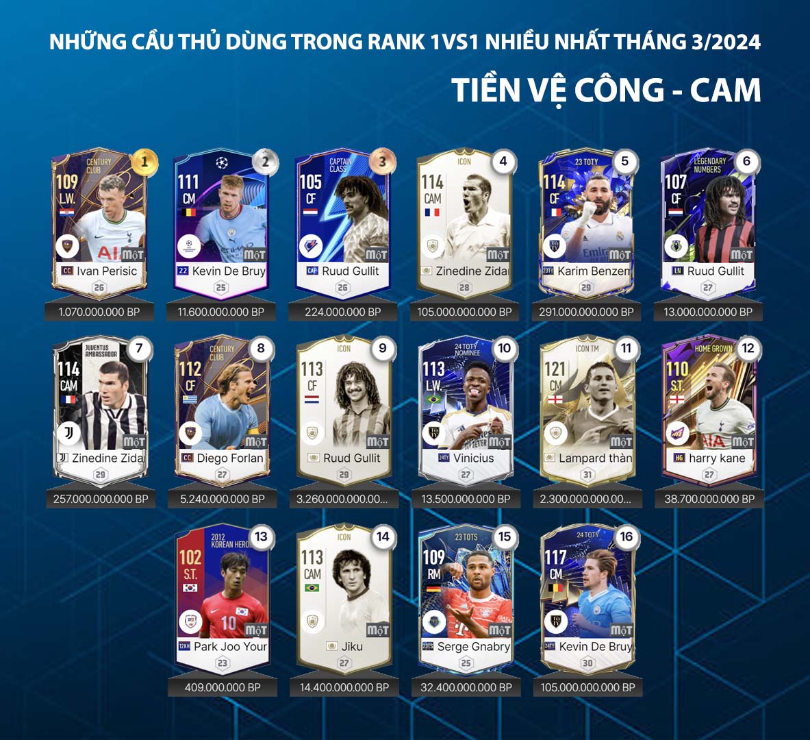 Danh sách dưới đây được thống kê từ máy chủ về những cái tên được sử dụng nhiều nhất trong tháng qua của những game thủ rank cao tại máy chủ xếp hạng. Đây được xem là một trong những nội dung tham khảo đáng quan tâm và fo4vn.net hôm nay gửi tới cho các bạn danh sách những tiền vệ được sử dụng nhiều nhất trong tháng 3.