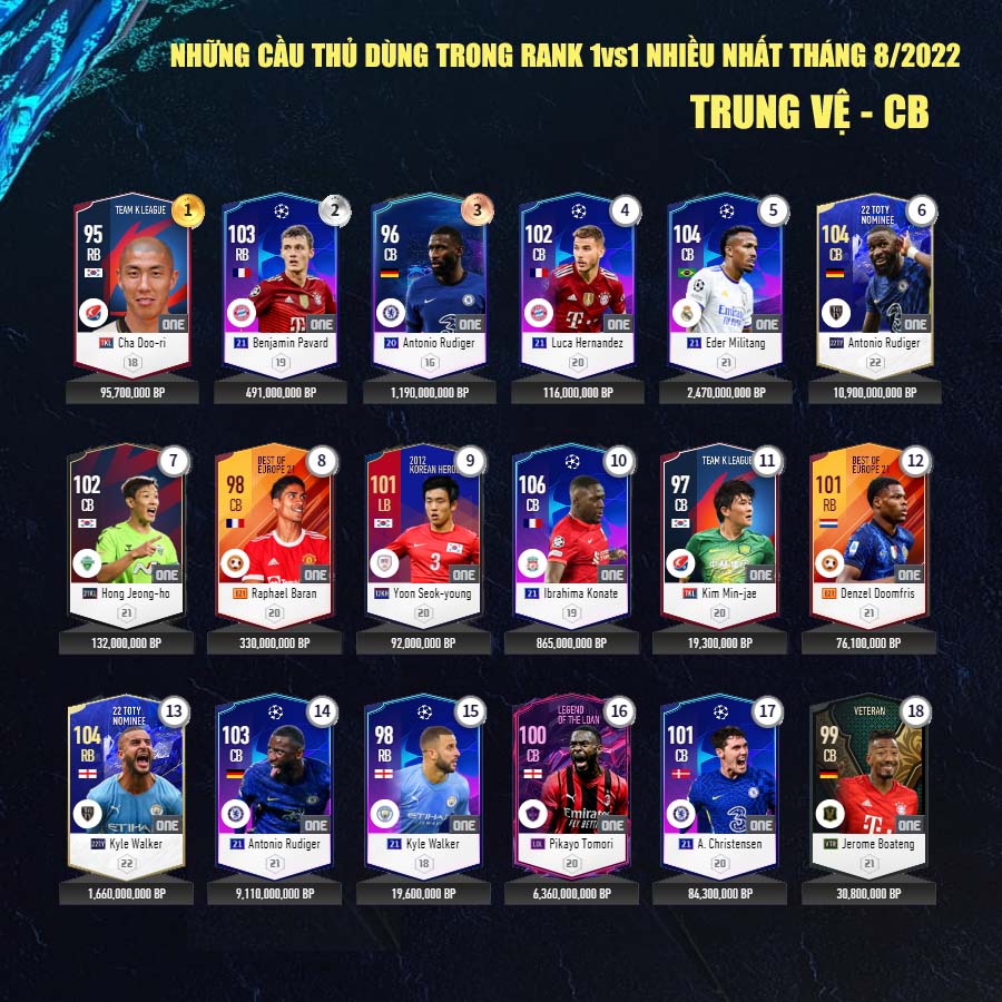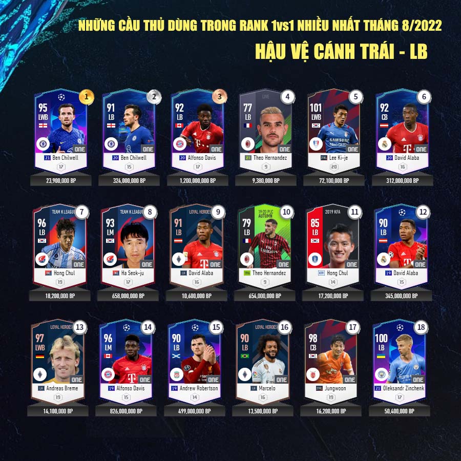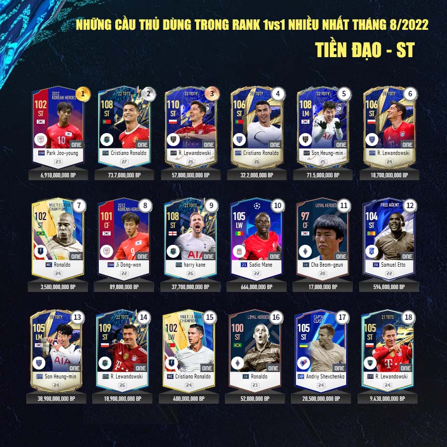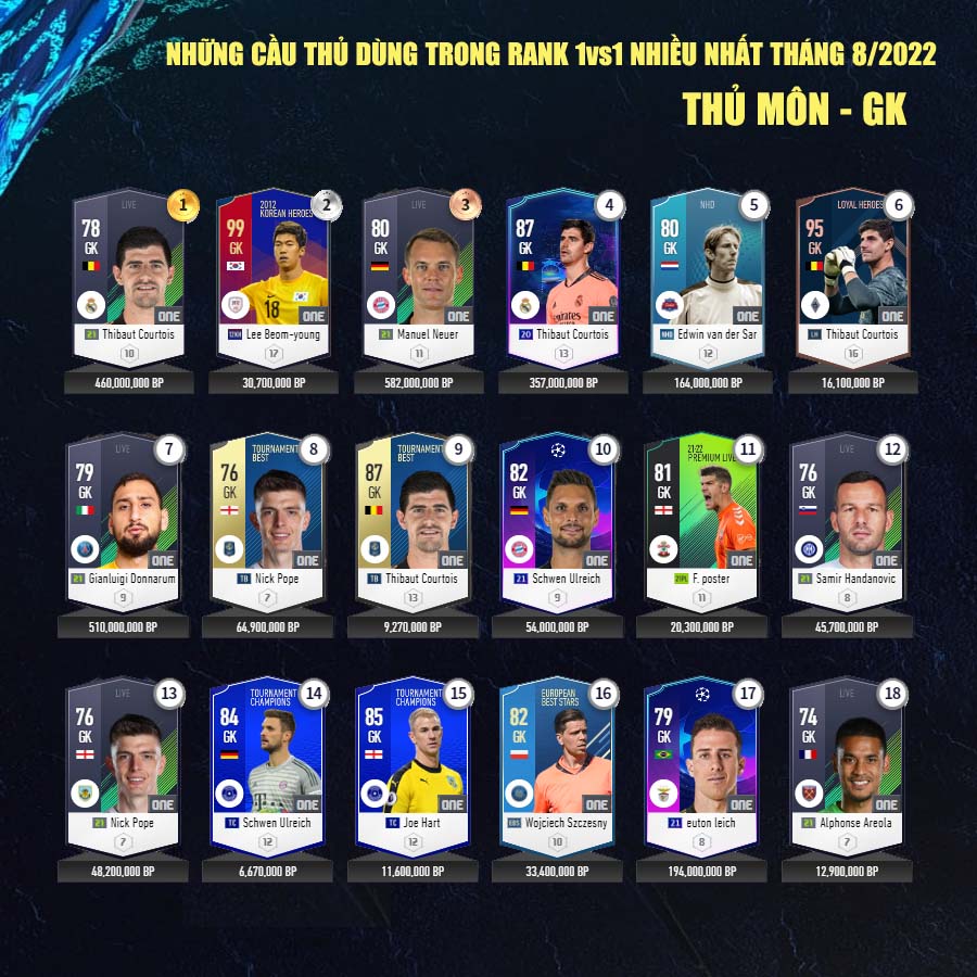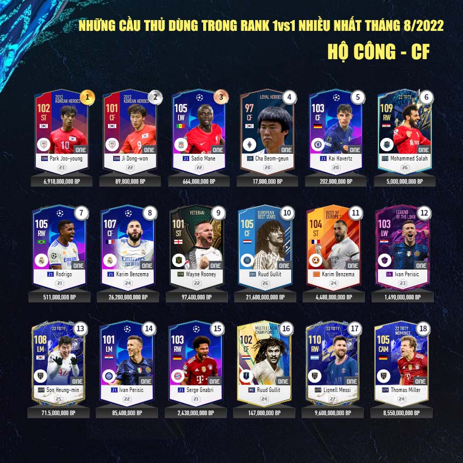 Tháng 8, với mùa giải 22TOTS nhiều sự thay đổi trong lối chơi đã dẫn tới nhiều sự xáo trộn trong các bảng xếp hạng cầu thủ. Nhiều mùa giải cũ đã dần lùi lại để nhường chỗ cho các mùa mới với chỉ số tốt hơn, phù hợp hơn. Dưới đây là những thống kê dành cho các bạn làm tư liệu tham khảo trong tháng 8.