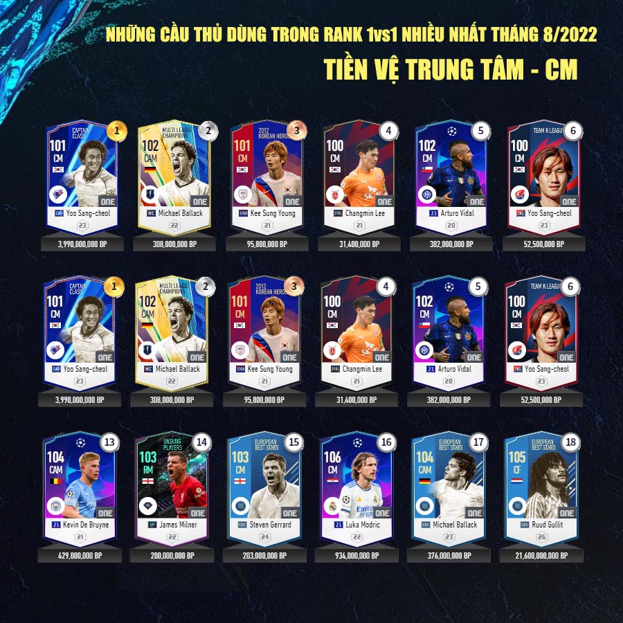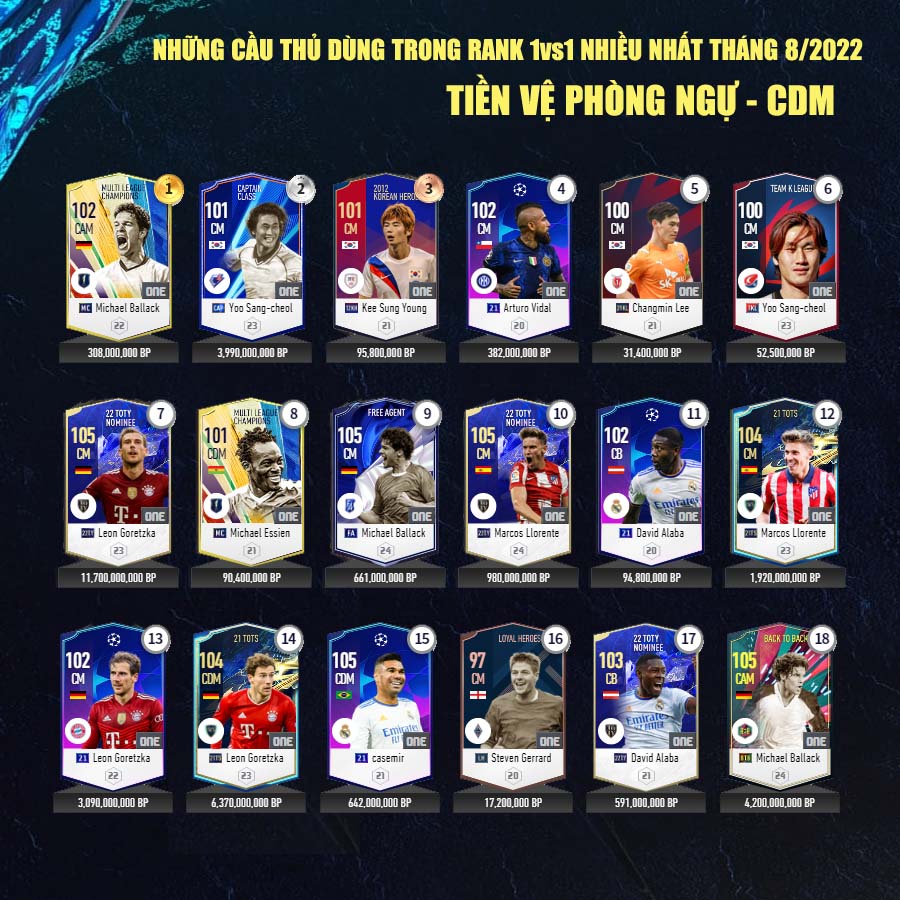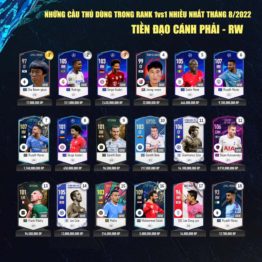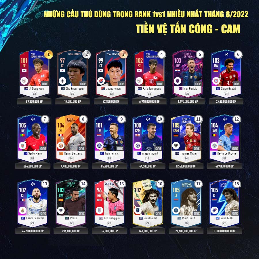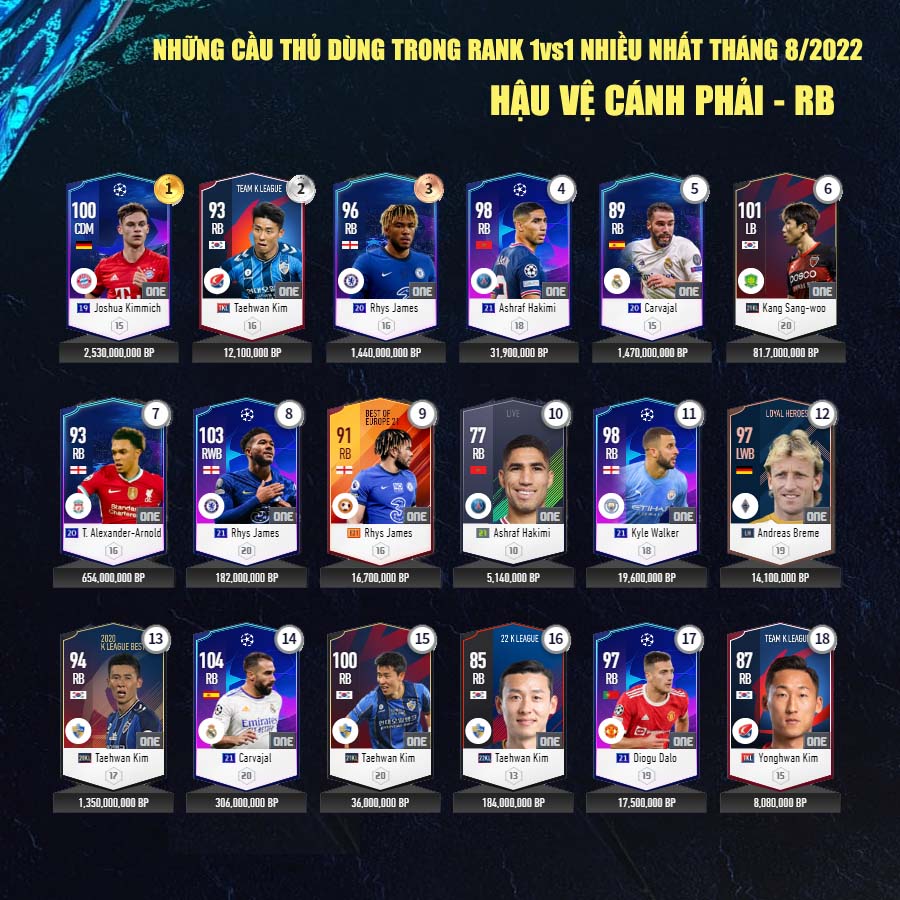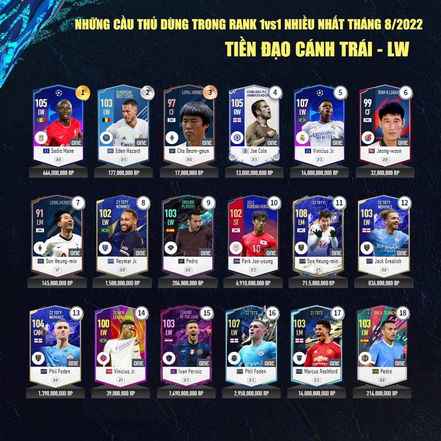 Tháng 8, với mùa giải 22TOTS nhiều sự thay đổi trong lối chơi đã dẫn tới nhiều sự xáo trộn trong các bảng xếp hạng cầu thủ. Nhiều mùa giải cũ đã dần lùi lại để nhường chỗ cho các mùa mới với chỉ số tốt hơn, phù hợp hơn. Dưới đây là những thống kê dành cho các bạn làm tư liệu tham khảo trong tháng 8.