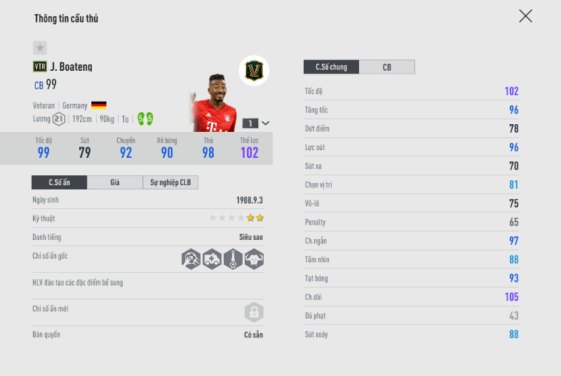 Hậu vệ số 1 của game hiện tại chính là chàng trai có cả sức lẫn tốc độ. Không phải là dạng thô thiển, Boateng thậm chí còn cực khéo và xoay sở rất tốt trong phạm vi hẹp. Việc mùa giải VTR của Boateng đứng top cả năm qua đã là minh chứng rõ nét nhất độ uy tín của mùa giải này