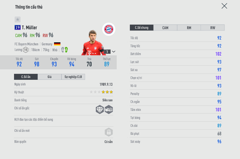 Cho dù có nhiều mùa giải với chỉ số cao hơn. Tuy nhiên mùa 19UCL của Muller lại có mức lương rẻ hơn rất nhiều so với hiệu suất mà cầu thủ này đem lại. Khả năng xâm nhập vòng cấm tốt, phạm vi hoạt động rộng cùng khả năng kết nối giữa các đồng đội được đánh giá rất cao. Đây chính là một CAM có mức lương rất rẻ cho các bạn đưa vào đội hình