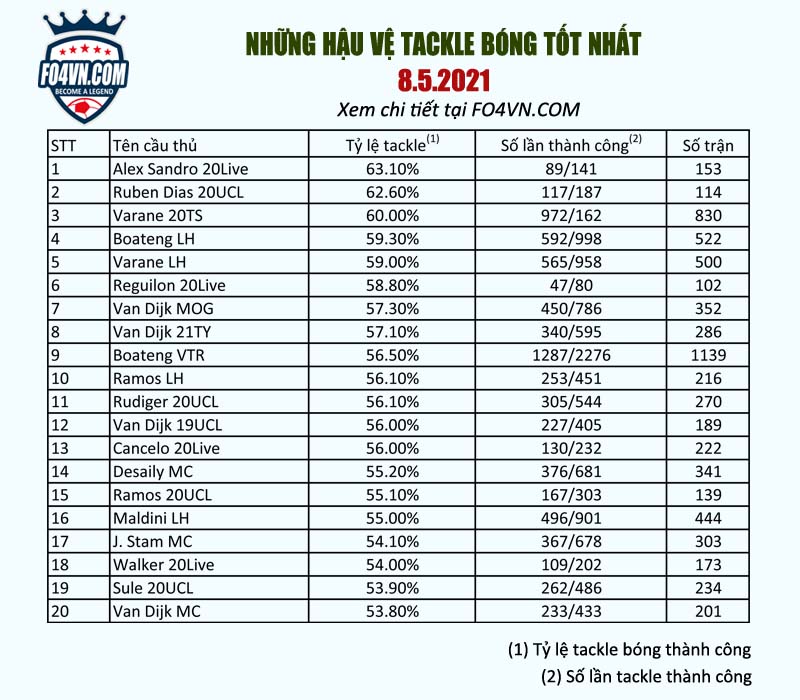 Dưới đây là thống kê những cầu thủ đánh chặn hay nhất trong top 1000 ranking