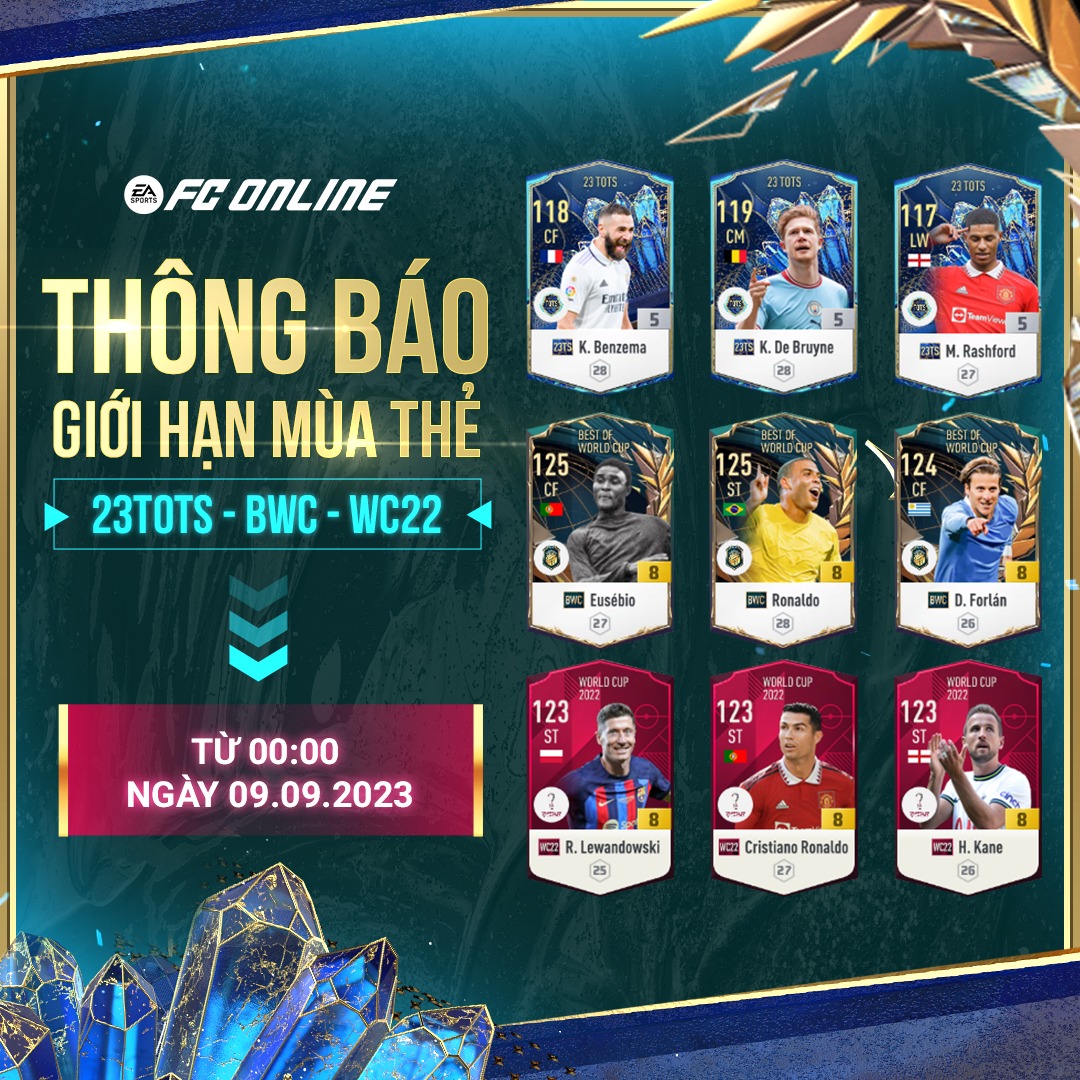 Theo thông báo từ phía garena, vào 0h ngày 9/9/2023 ba mùa giải là 23TS, WC22 và BWC sẽ chính thức bị giới hạn. Nếu như 23TS bị giới hạn với thông lệ quen thuộc của mùa giải này, thì WC22 và BWC lại liên quan đến vấn đề bản quyền giữa EA và liên đoàn bóng đá thế giới FIFA.