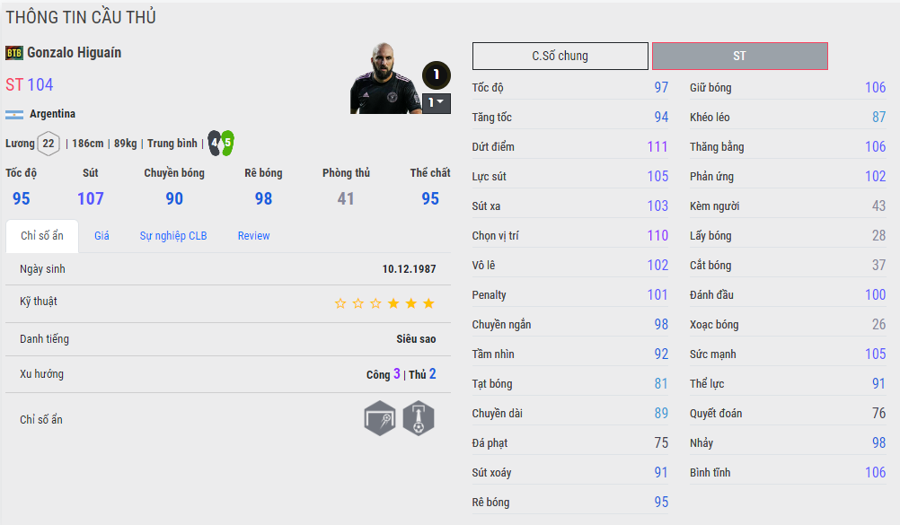 Trong GLXH có khá nhiều tiền đạo của Argentina hay như Milito với mùa HR, Lautaro Martinez với 23TS, 22UCL và WC22... Nhưng tiền đạo có thể nói là hợp với chế độ này nhất lại chính là Gonzalo Higuain BTB, đây là mùa giải mà Higuain có được thể hình cũng như chiều cao cân nặng khủng nhất và phù hợp với meta hiện nay.