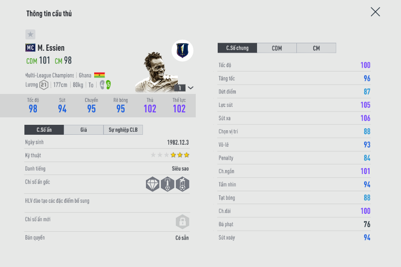 Top 1 là cái tên được tin tưởng nhất thời điểm hiện tại, Essien. Huyền thoại của Chelsea đang là cái tên được tin dùng và săn đón bậc nhất game. Lối chơi toàn diện công thủ, thể lực dồi dào, vào bóng chắc, rắn, ít bị ngã ở các tình huống tranh chấp trong game. Kỹ nằng phòng ngự của Essien là vô cùng đáng nể.