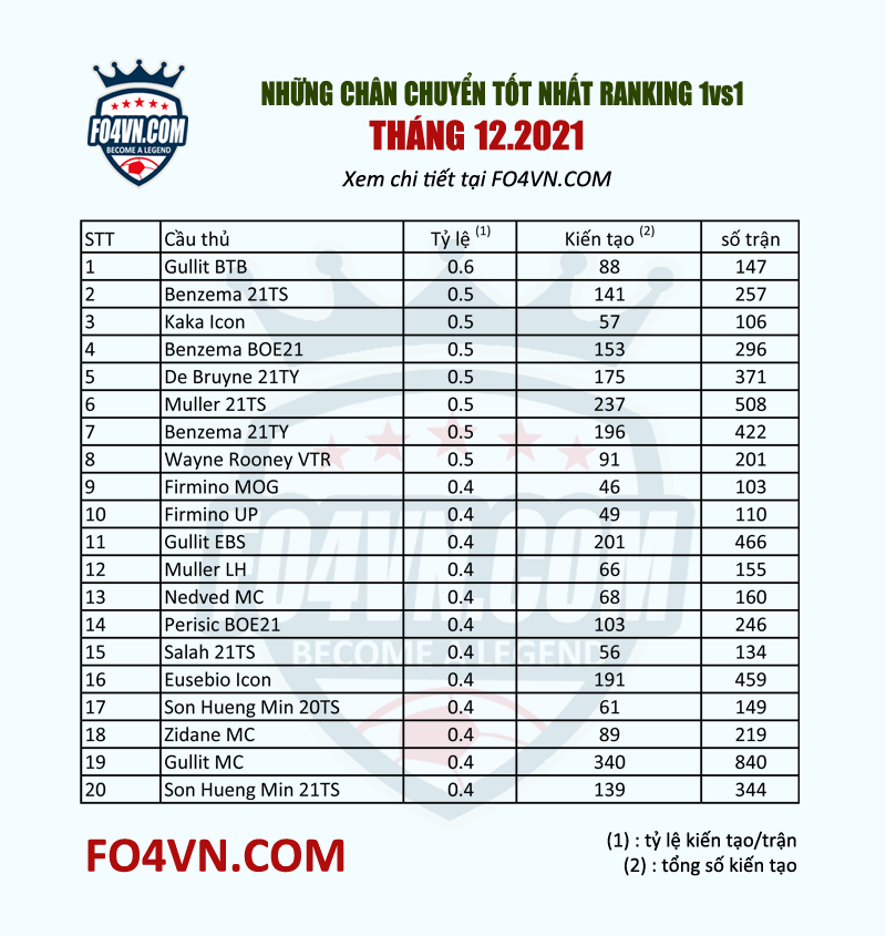 - Gullit BTB leo lên top 1 với tỷ lệ 0.6 cao nhất khẳng định sự toàn diện của tiền đạo này