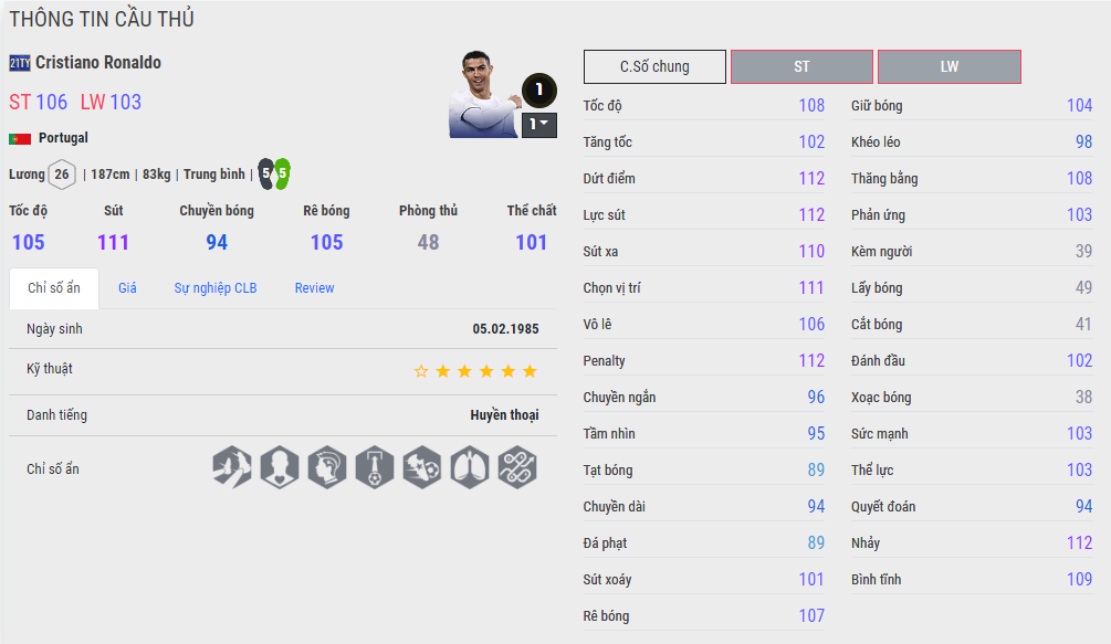 Có thể nói mặc dù không còn chơi bóng ở châu Âu, nhưng Cr7 vẫn là cái tên uy tín nhất ở vị trí tiền đạo trong Fo4. Mùa giải 21TY của anh cho đến nay vẫn được coi là mùa giải hoàn hảo nhất. Không nói đâu xa, nếu hàng ngày bạn lượn qua các group Fo4 thì bạn sẽ thấy số lượng người chơi săn đuổi mùa giải này vẫn còn rất đông, dù các mùa khác ra mắt với chỉ số to hơn nhưng không vì thế mà 21TY hạ nhiệt.