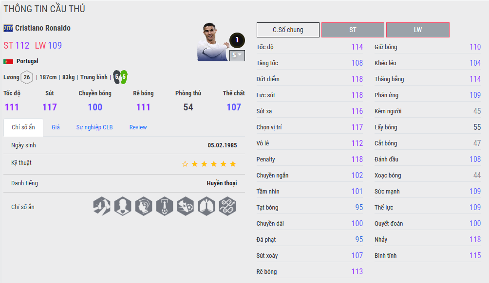 Tiền đạo toàn diện bậc nhất trong game hiện nay, và mùa giải hay nhất của số 7 vẫn là mùa giải 21TY. Đây có lẽ là phiên bản out meta nhất của anh bảy trong ít nhất 6 tháng đến 1 năm nữa. Cùng với đó là hai mùa giải WC22 và BTB, đáng chú ý là mùa BTB hiện nay đang được rất nhiều HLV Việt Nam ưa chuộng bởi tốc độ và dàn chỉ số ẩn quá hữu dụng.