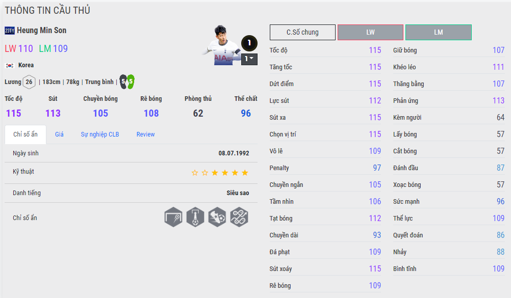 Tiền đạo người Hàn Quốc cũng là một trong 3 cái tên có tỷ lệ dứt điểm tốt nhất game chỉ với việc ấn D mà thôi. Cứ mỗi một mùa giải mới ra mắt thì cảm giác Nexon lại nâng tầm Son lên một nấc thang mới, việc sở hữu tiền đạo này cũng dễ dàng hơn nhiều so với Ronaldo và Lewandowski do team color của Son khá hạn chế.