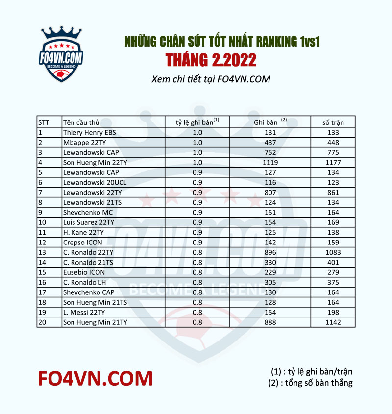 Với sự xuất hiện của mùa giải 22TY, bảng danh sách các chân sút tháng 2 có rất nhiều những gương mặt của mùa giải này. Tuy nhiên nếu nhìn bảng danh sách này dễ dàng nhận ra Lewandowski vẫn là cái tên hot nhất của game hiện tại.