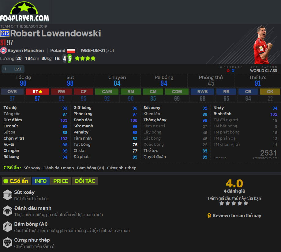 Lewandowski mùa giải này đã có Đánh đầu mạnh. Cùng với đó là khả năng chọn vị trí cũng như chỉ số đánh đầu rất cao. Lewy hứa hẹn sẽ là một con hàng tiền đạo cực kì toàn diện trong thời gian sắp tới.
