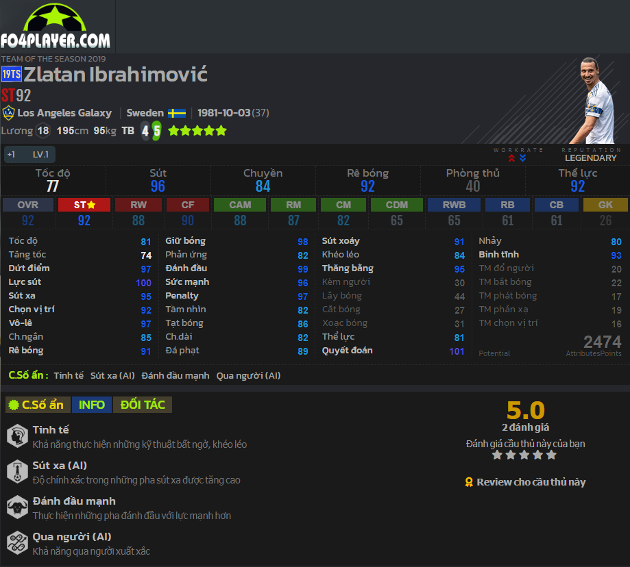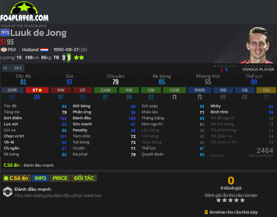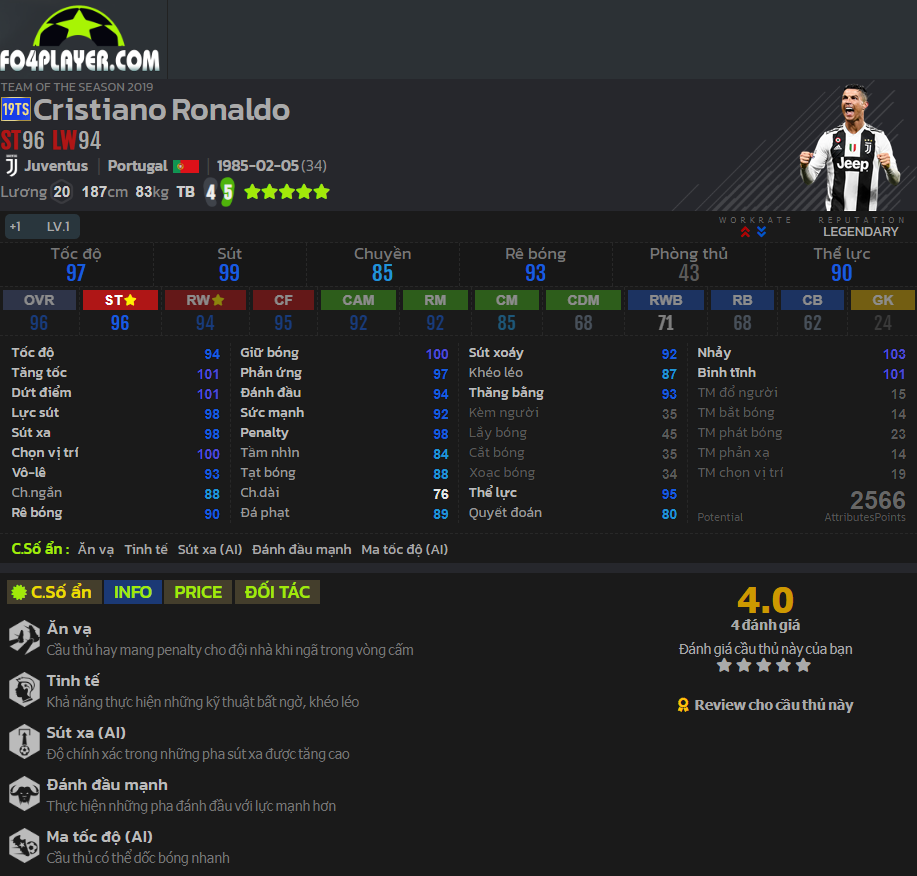 Không phải bàn cãi khi CR7 là một trong những tièn đạo toàn diện và được tin dùng bậc nhất hiện nay. Mùa giải này Ronaldo còn có thêm chỉ số ẩn đánh đầu mạnh. Điều này sẽ còn hỗ trợ rất nhiều cho những tình huống không chiến của CR7 và khiến anh trở thành quái thú thực sự nơi hàng công.