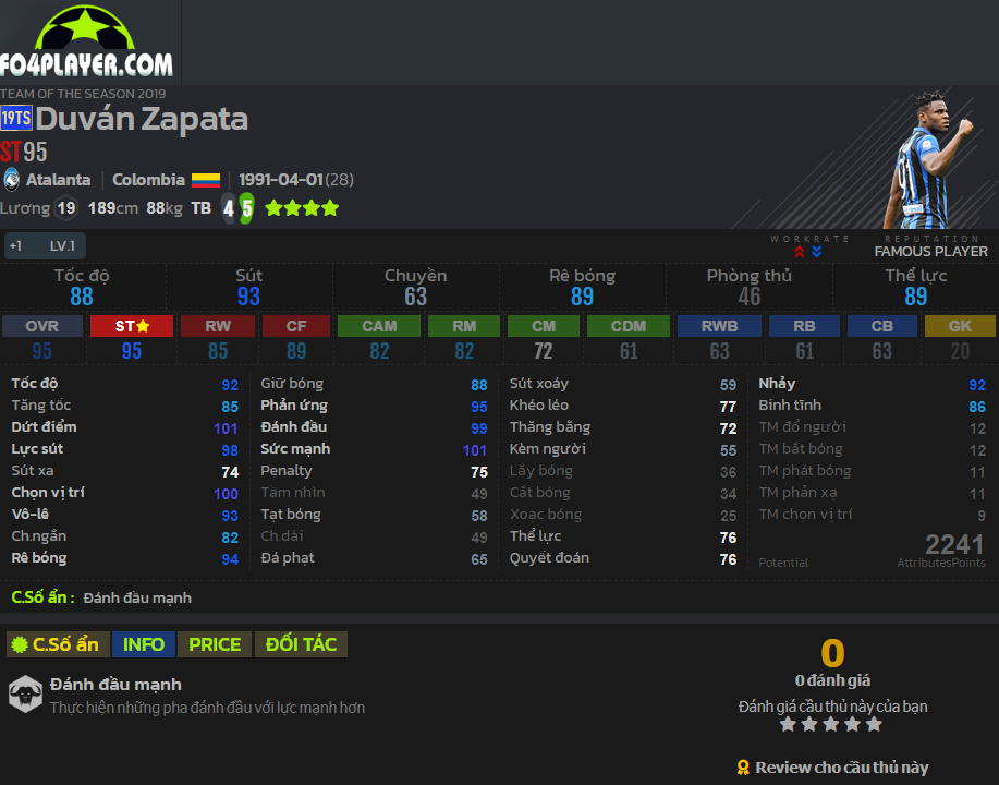 Zapata hiện đang được ví như Drogba mới của bóng đá hiện tại cũng như FIFA Online 4. Chiều cao 1m89, nặng 88kg, thể hình trung bình và có tới 4 sao kỹ thuật. Chỉ số sức mạnh, chọn vị trí cũng như dứt điểm đều rất cao. Chỉ số đánh đầu 99 cùng CS ẩn đánh đầu mạnh hứa hẹn anh sẽ là một trong những con hàng cực kì chất lượng và được săn đón ở mùa giải 19TS.