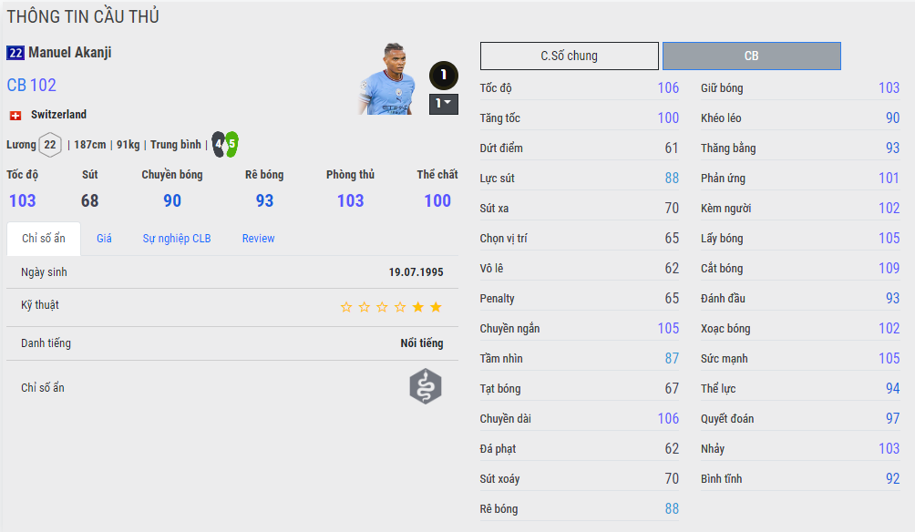 Có mức xuất phát điểm rất thấp khi chỉ có 102, khiến cho Akanji sẽ được tăng chỉ số rất nhiều nếu như Man City đi sâu tại giải đấu năm nay, việc CLB của Pep Guardiola lọt vào sâu đấu trường C1 rõ ràng là một bài toán khá dễ đoán với nhiều người. Trung vệ này có tốc độ và chiều cao khá ổn, Akanji cũng có được Ai khá ngon trong các mùa giải gần đây.
