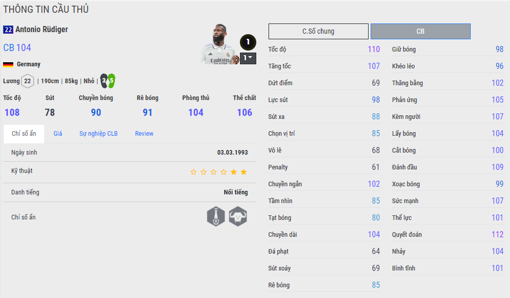 Không có tên trong mùa giải 22TS và 23TY khiến cho rất nhiều người yêu thích trung vệ này cảm thấy sốt ruột. Tuy nhiên không sao cả, 22UCL với chỉ sô tốc độ khủng sẽ giải tỏa cơn khát đó cho các game thủ FO4, cơ hội lọt vào sâu của Real vẫn là rất cao và chắc chắn Rudiger ngoài chất lượng về mặt sử dụng thì đây còn là chất lượng về mặt đầu tư tài chính, mức lương của trung vệ này có 22 thôi