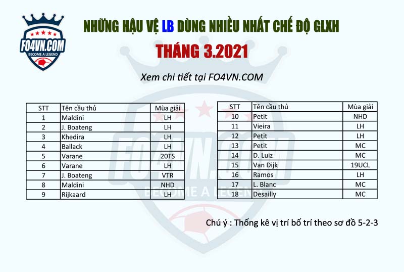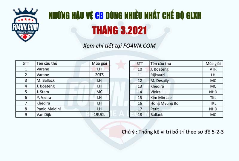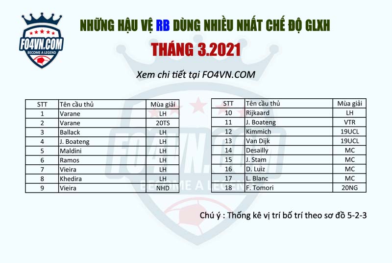 Vị trí RB không có nhiều khác biệt lắm so với CB ở vị trí dẫn đầu. Tuy nhiên lời khuyên của chúng tôi là nếu bạn nên chọn Ballack cho CB và Varane cho RB