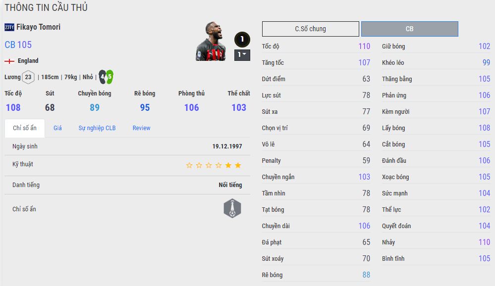 Không thể phủ nhận giờ đây Tomori mới là trung vệ tốt nhất của Ac Milan trong game, sở hữu tốc độ nhanh không thua kém gì các tiền đạo, AI cắt bóng và đánh chặn hoàn hảo. Tomori có thể bắt chết được các cầu thủ đối phương cho dù đó là một cái tên nhanh như Henry. Với tốc độ này Tomori có thể cho phép người chơi sửa chữa sai lầm của mình nếu như có xảy ra lỗ hồng trong hàng thủ.