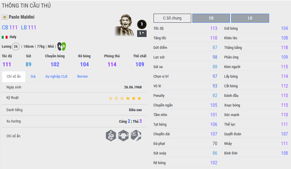 Là huyền thoại của Ac Milan và là hậu vệ xuất sắc nhất thế kỷ 20, thời kỳ đầu game thì Maldini vẫn luôn là cầu thủ hay nhất ở hàng thủ. Nhưng rồi thời gian qua đi, khi mà Nexon quyết định tạo ra sự thay đổi trong tư duy người chơi, khuyến khích người chơi sử dụng các cầu thủ đương đại nhiều hơn thì Maldini dần mất đi độ bá. Nói thế không có nghĩa là Maldini không còn hay, vấn đề chính là mức giá để sở hữu thẻ ICON cũng như mức lương có phần cao của Maldini đã cản trở các HLV lựa chọn huyền thoại này cho đội hình của mình.