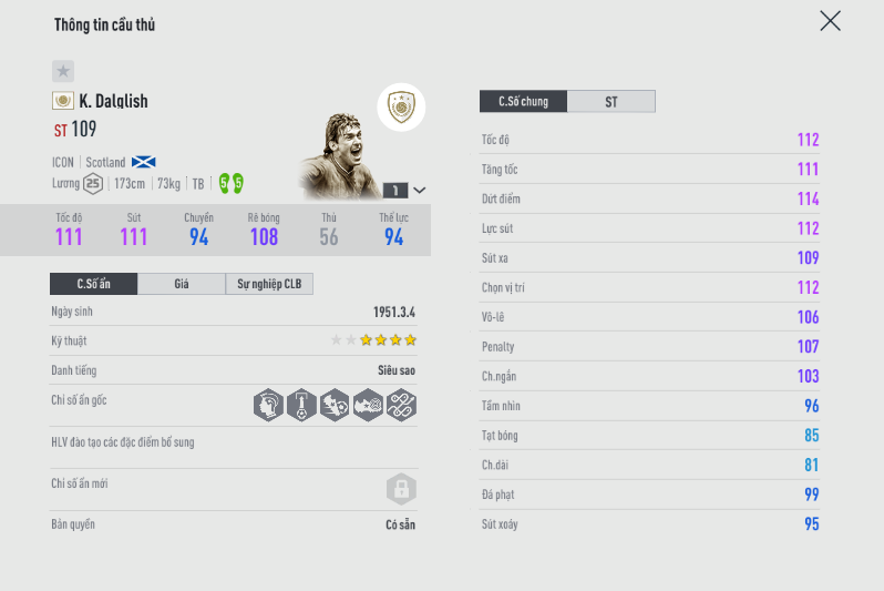 Bạn sẽ bất ngờ với cái tên đứng đầu này, nhưng thực sự thì Dalglish đang là cây săn bàn hiệu quả nhất mùa giải ICON. Với tỷ lệ trung bình 1,1 bàn/trận. Sở hữu tốc độ cực cao, cho dù thể hình hạn chế và sức mạnh không dọa được ai. Nhưng khả năng xâm nhập của ông là điểm cộng lớn cho sự nguy hiểm. Nếu bạn đã dùng qua cái tên Aguero MOG thì có thể hiểu Dalglish chính là phiên bản hoàn hảo.