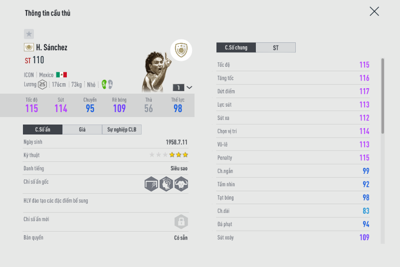 Thêm một cái tên nữa không có thể hình tốt là Hugo Sanchez của Mexico. Nếu bạn đã từng xem ông thi đấu trong màu áo Real thì sẽ hiểu tại sao ông được liệt vào danh sách các ICON. Tốc độ cũng khả năng chọn vị trí cực tốt sẽ là vũ khí lợi hại của Hugo. Bài tấn công sộc xuống cánh rồi căng ngang vào sẽ cực hữu dụng. Tỷ lệ 0.9 bàn/trận