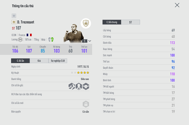 Trezeguet được hồi sinh từ sau bản update này, khi mà anh chơi rất toàn diện, mặc dù không khỏe như Drogba, nhưng bù lại Trezeguet phối hợp và chuyền chọc cho đồng đội cực tốt. So với những cái kể trên thì tiền đạo Juventus có chỉ số kiến tạo cao hơn hẳn. Tỷ lệ 0.7 bàn/trận