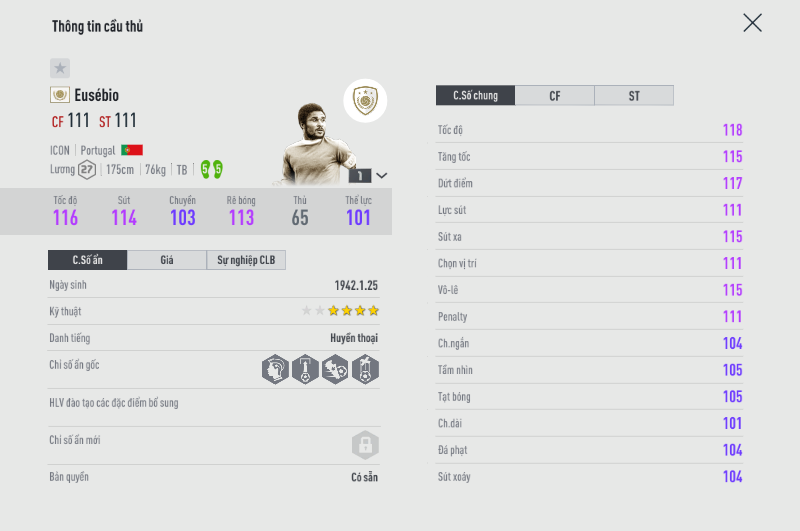 Bạn thắc mắc tại sao "cụ" lại rơi xuống sâu thế này. Thật ra Eusebio cực dễ chơi và dễ trúng thưởng, Đây vẫn là cái tên cực kỳ nguy hiểm. Do quá nhiều người sử dụng, thậm chí cả những người rank không cao cho lắm, nên chỉ số ghi bàn của huyền thoại Bồ Đào Nha không cao bằng những cái tên phía trên, những cũng đạt 0.8 bàn/trận